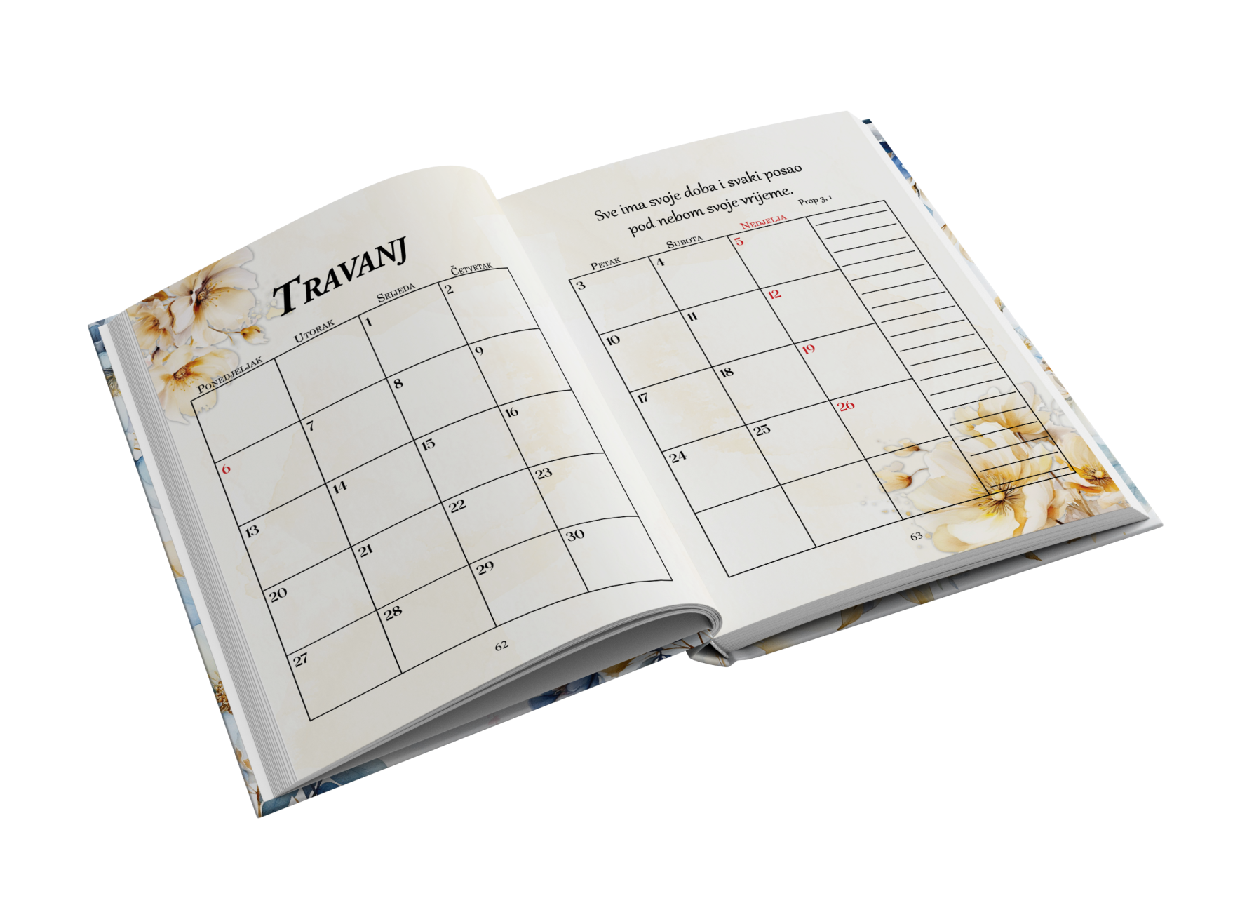 • Mjesečno i tjedno planiranje, prostor za bilješke, popis ciljeva, planova i obveza, važnih datuma, rođendana